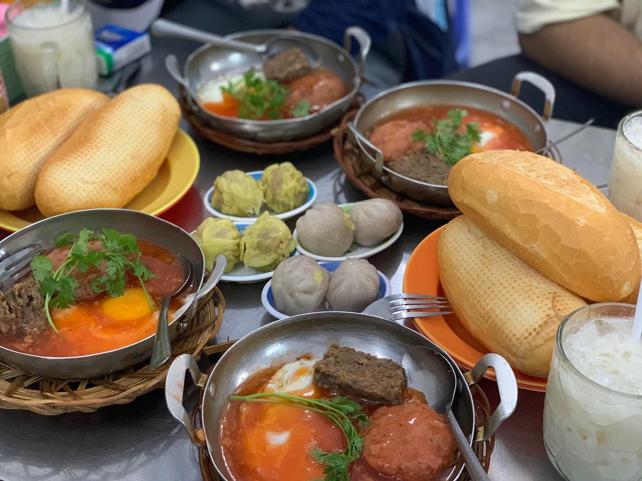 Bánh mì Hòa Mã: Trải nghiệm ăn bánh mì chảo độc đáo với trứng ốp la, pate, xúc xích được phục vụ trên một chiếc chảo gang nóng hổi, ăn kèm bánh mì nóng giòn.